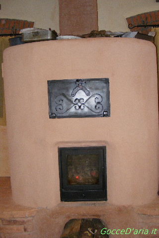Il forno-stufa in argilla (notare sopra gli impasti tenuti al al caldino)