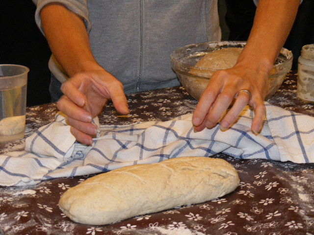 Il pane pronto per la cottura: è stato reimpastato, è stato formato il filone, sono stati fatti i tagli per favorire la lievitazione. Sullo sfondo a sinistra è pronta la pallina che indicherà quando infornare, a destra il primo impasto che lievita.