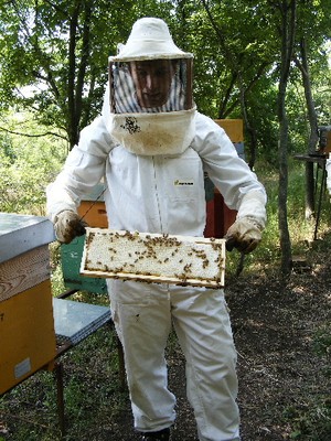 8 - mielario prontoAlberto ci mostra un mielario pronto per la raccolta: tutte le celle sono piene di miele e coperte da un tappo di cera (il colore è chiero perchè è miele di acacia)